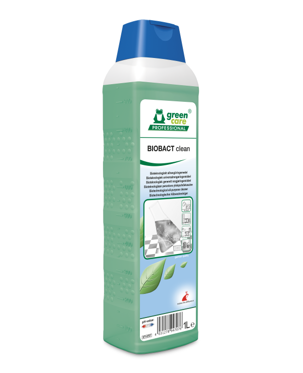BIOBACT clean is een pH-neutrale biotechnologische reiniger. BIOBACT clean reinigt en elimineert gelijktijdig onaangename geuren en combineert een snelle chemische werking met een langdurige microbiële activiteit.