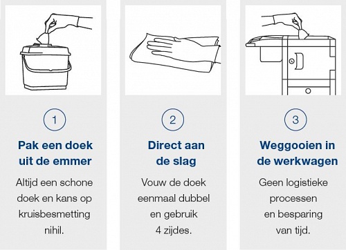 Het Wecoline Clean ’n Easy concept bestaat uit keuken, interieur, sanitair en hygiënische doeken. Doormiddel van de kleur van de doeken past elke schoonmaker moeiteloos de juiste doek toe. De Clean ‘n Easy Single Use zijn voor eenmalig gebruik, het was proces is hiermee verleden tijd! Een emmer Clean ‘n Easy wordt geleverd met één rol à 150 doeken.