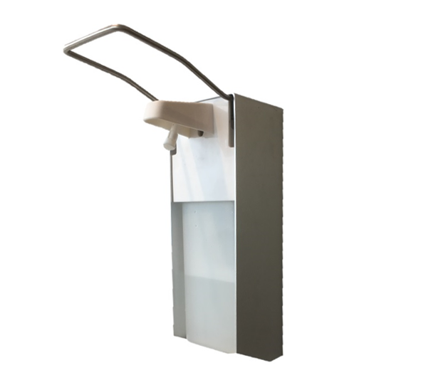 Aluminium zeep-& Desinfectiemiddel dispenser met elleboogbediening en flacon.