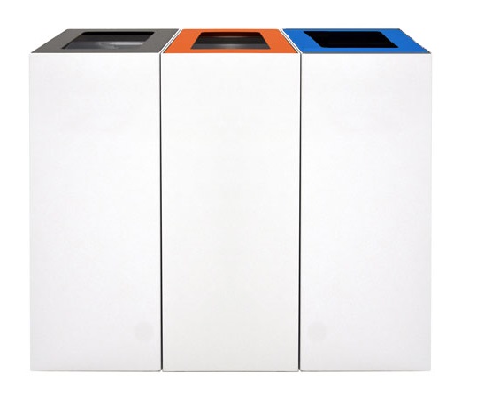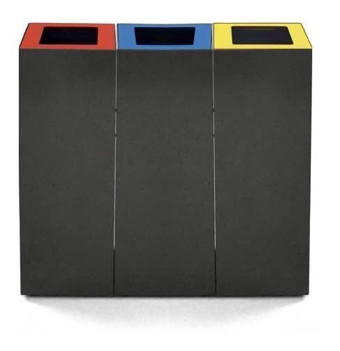 Zeer degelijke modulaire afvalbak van gepoedercoat staal voorzien van zakhoudbeugels en verstelbare pootjes. Inclusief connectiemateriaal zodat de drie units aan elkaar gekoppeld kunnen worden voor een afvalscheidingsstation voor meerdere afvalstromen.