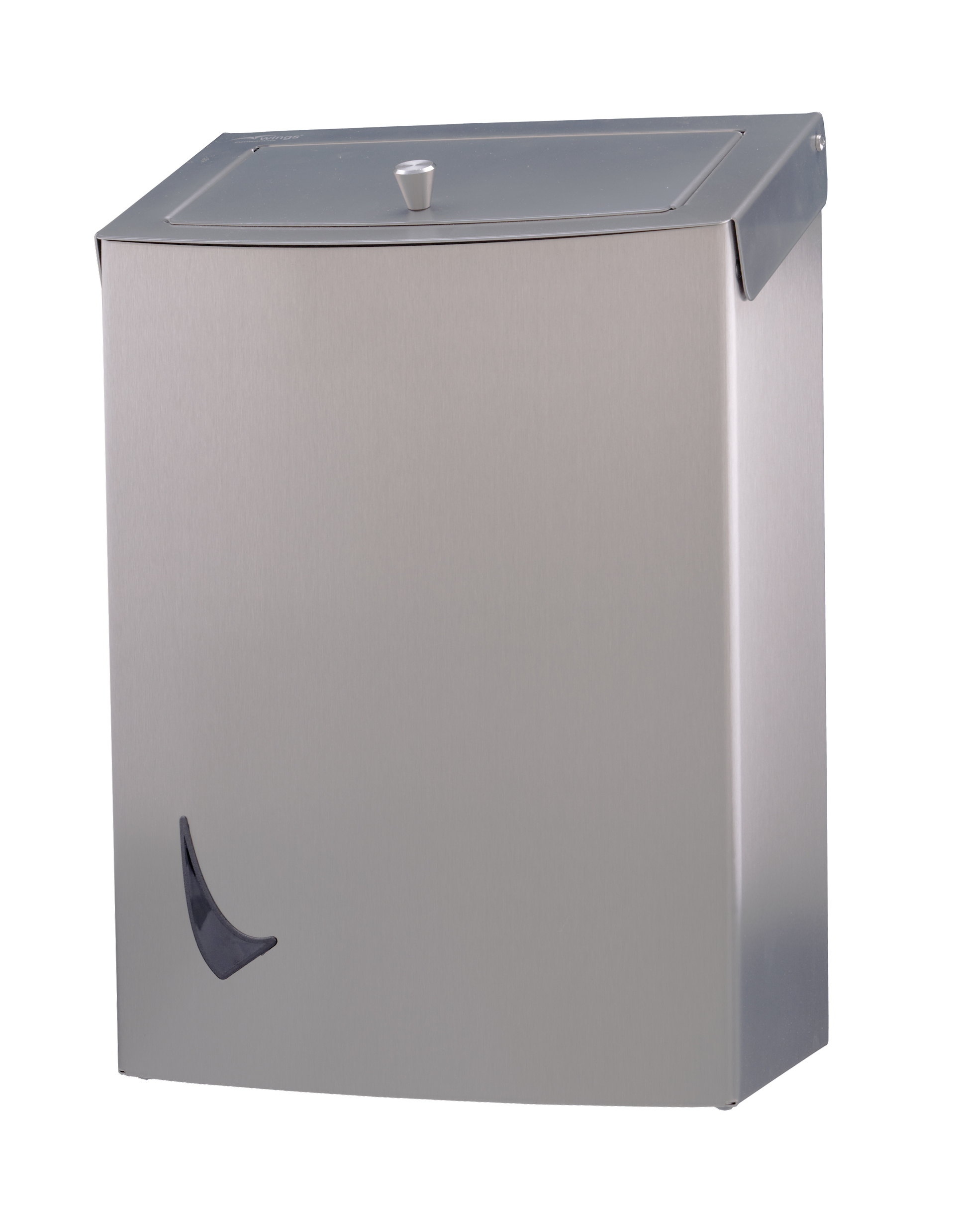 Met binnenring. Met compact knopje om de hygiënebak te openen. Voor wandmontage. Met schuin aflopende bovenzijde en wings venster links onderaan.