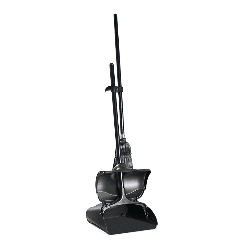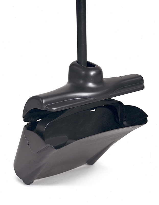 Kunststof blik met steel en automatisch openend en sluitend deksel dat vuil en stof verbergt. Voorzien van wielen aan de achterzijde.
